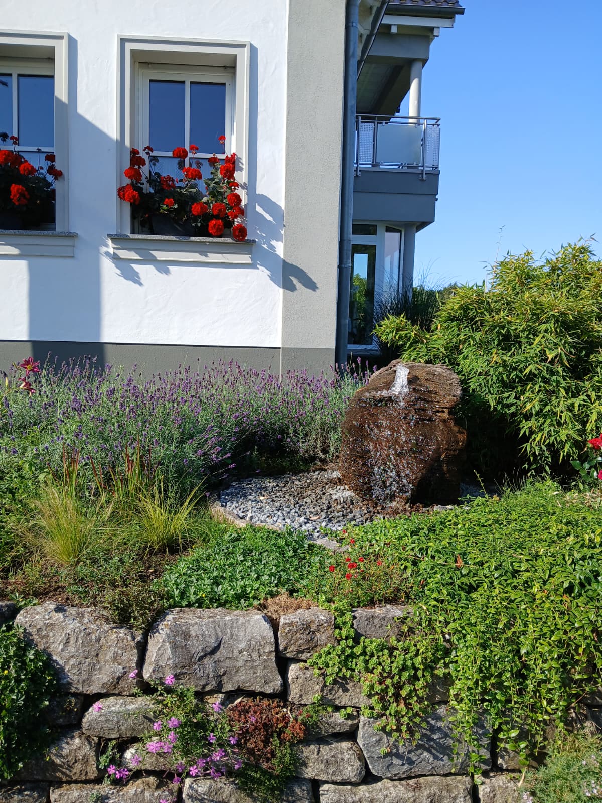 Ein kurvenreicher Bachlauf aus Naturstein bringt Bewegung auch in kleine Hanggärten, architektonische Wasserbecken bereichern Sitzplätze und bieten Platz für Wasserpflanzen und Amphibien.
